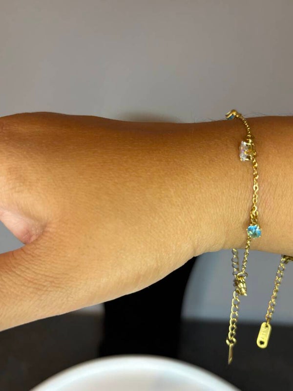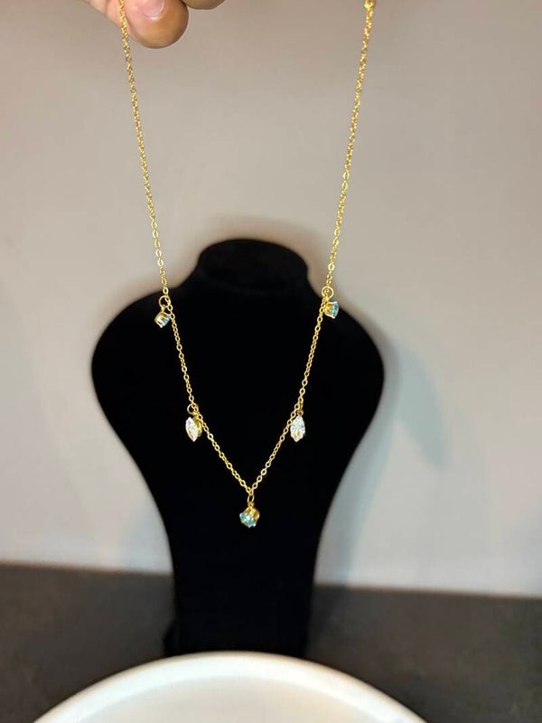 Un collier et un bracelet dorés ornés de pierres bleues et blanches étincelantes, qui reflètent la lumière à chaque mouvement.
