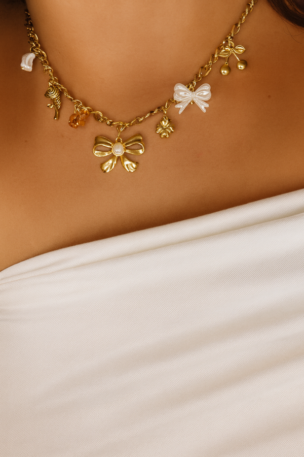 Ornée d’un pendentif nœud central rehaussé d’une perle, et accompagnée de charms raffinés (papillon, trèfle, étoile, fleur et rose), elle apporte une touche romantique et tendance à toutes vos tenues. ✨