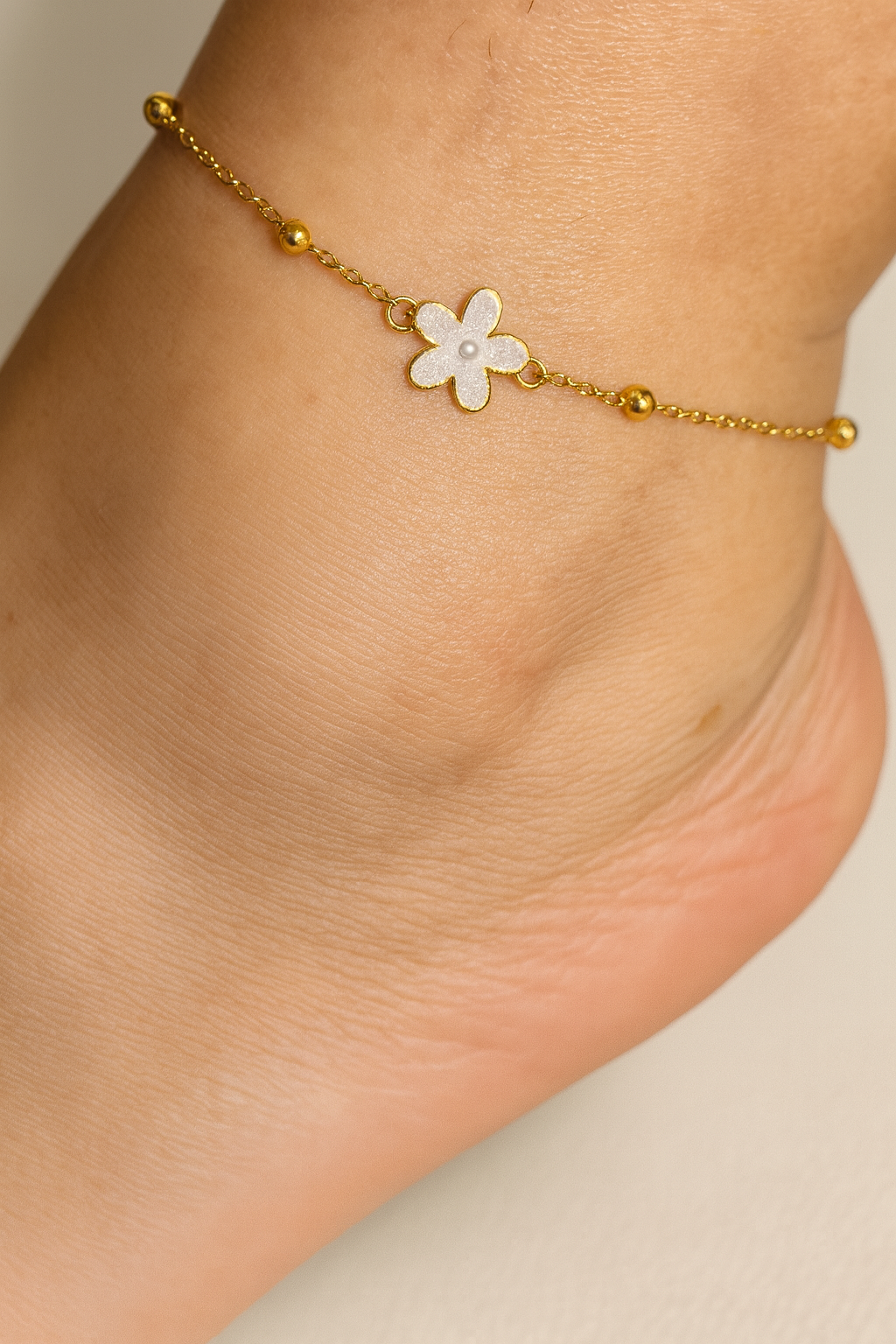 Ce bracelet de cheville doré orné d’une fleur nacrée apporte une touche de douceur et d’élégance à vos tenues estivales.