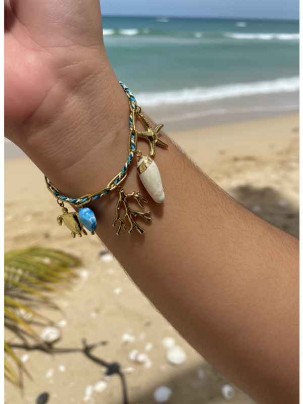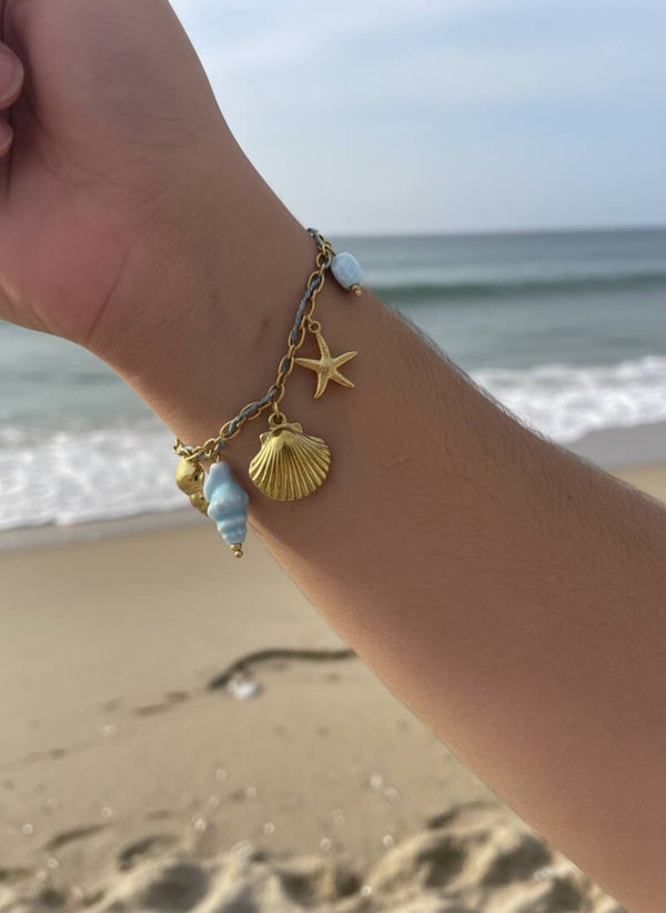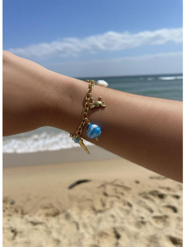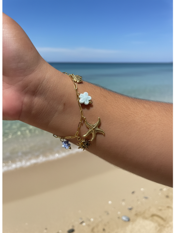 Chaque bracelet est orné de charms marins soigneusement choisis : étoiles de mer, coquillages, fleurs bleu lagon, soleils dorés… autant de symboles féminins et estivaux qui racontent la douceur des vacances.