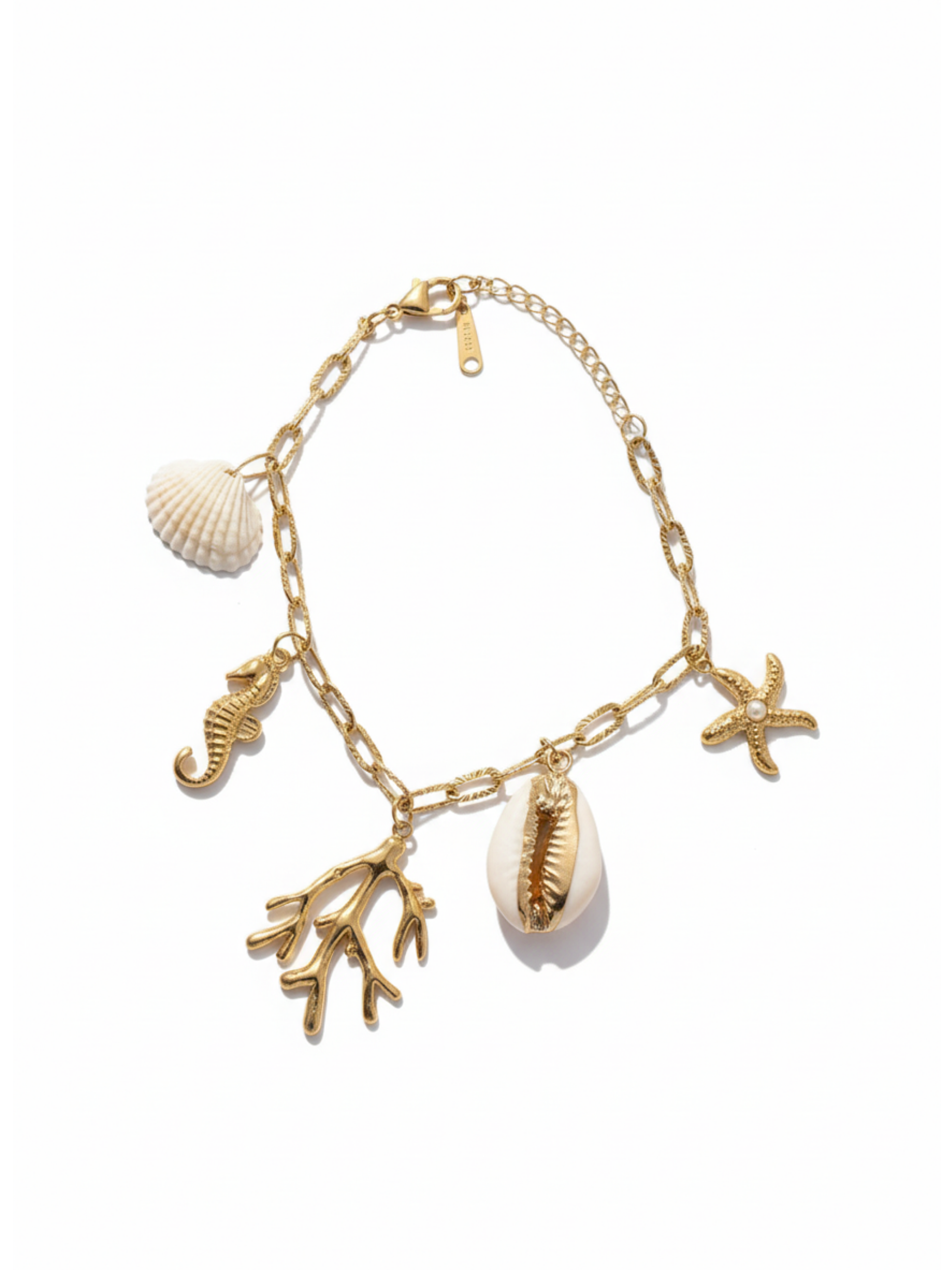 Un bracelet doré avec corail, étoile de mer, hippocampe et un beau cauri blanc.